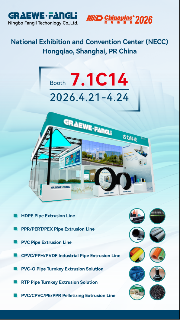 मराठी ChinaPlas 2026-da 7.1C14 stendimizə xoş gəlmisiniz,Ningbo Fangli Technology Co., Ltd.(bundan sonra "Fangli" adlandırılacaq) elmi-tədqiqat, istehsal və satış üzrə ixtisaslaşmışdır.plastik ekstruziya avadanlığı, ətraf mühitin mühafizəsi üzrə yeni istehsal xətləri, plastik boru qaynaq maşınları və plastik köməkçi maşınlar.